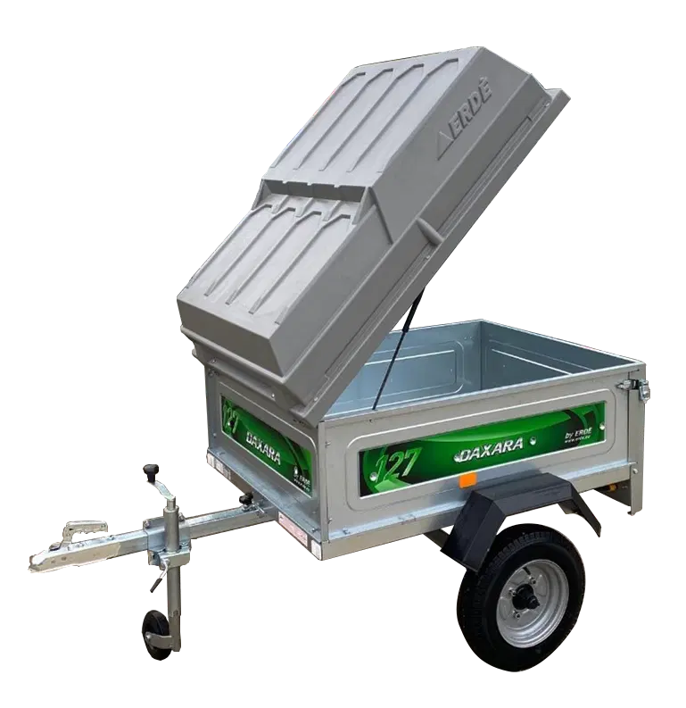 Daxara 127, a versatile unbraked 4' x 3' single axle trailer perfect for camping and utility use. This small covered trailer boasts galvanised pressed steel sides, a sturdy galvanised steel chassis, steel mudguards, and a 50mm pressed steel hitch with a secondary coupling chain for added security. With a gross weight of 400kgs and a carrying capacity of up to 335kgs, it's an excellent choice for transporting all your camping gear on your next family staycation. The Daxara 127 comes standard with inset rear light clusters, hooks to accommodate an enclosed trailer cover, and a convenient drop-down rear tailgate. Its tipping body feature makes unloading a breeze, and it's designed for space-saving vertical storage.