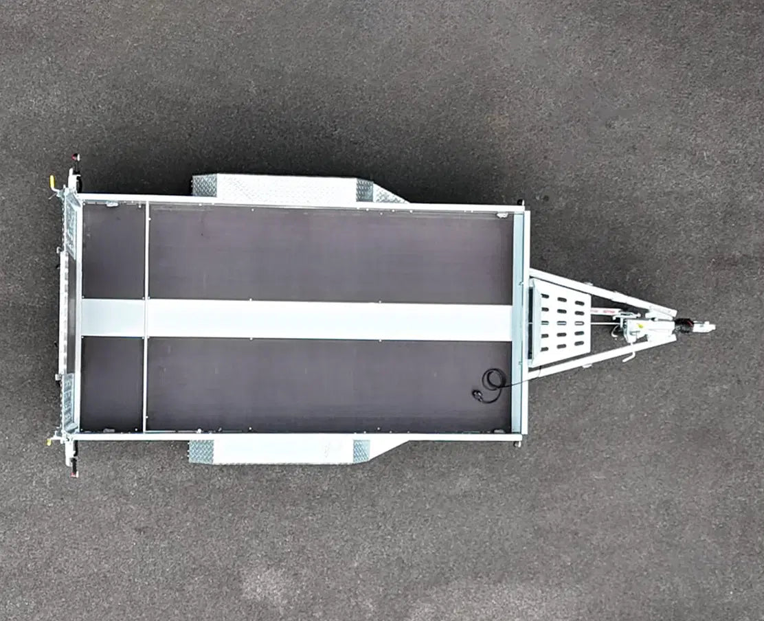 This trailer's reinforced, non-slip floor, designed for heavy loads, ensures maximum stability during construction material transportation. Supported by sturdy longitudinal chassis beams, it guarantees structural integrity, safeguarding valuable cargo such as mini diggers.