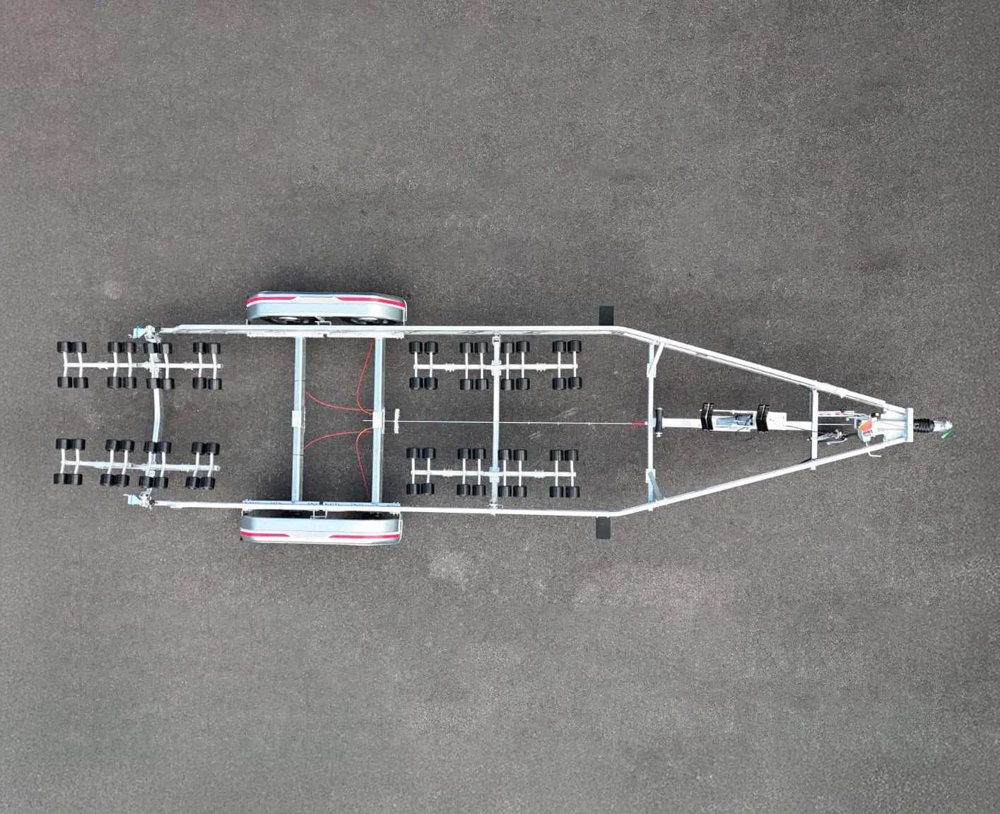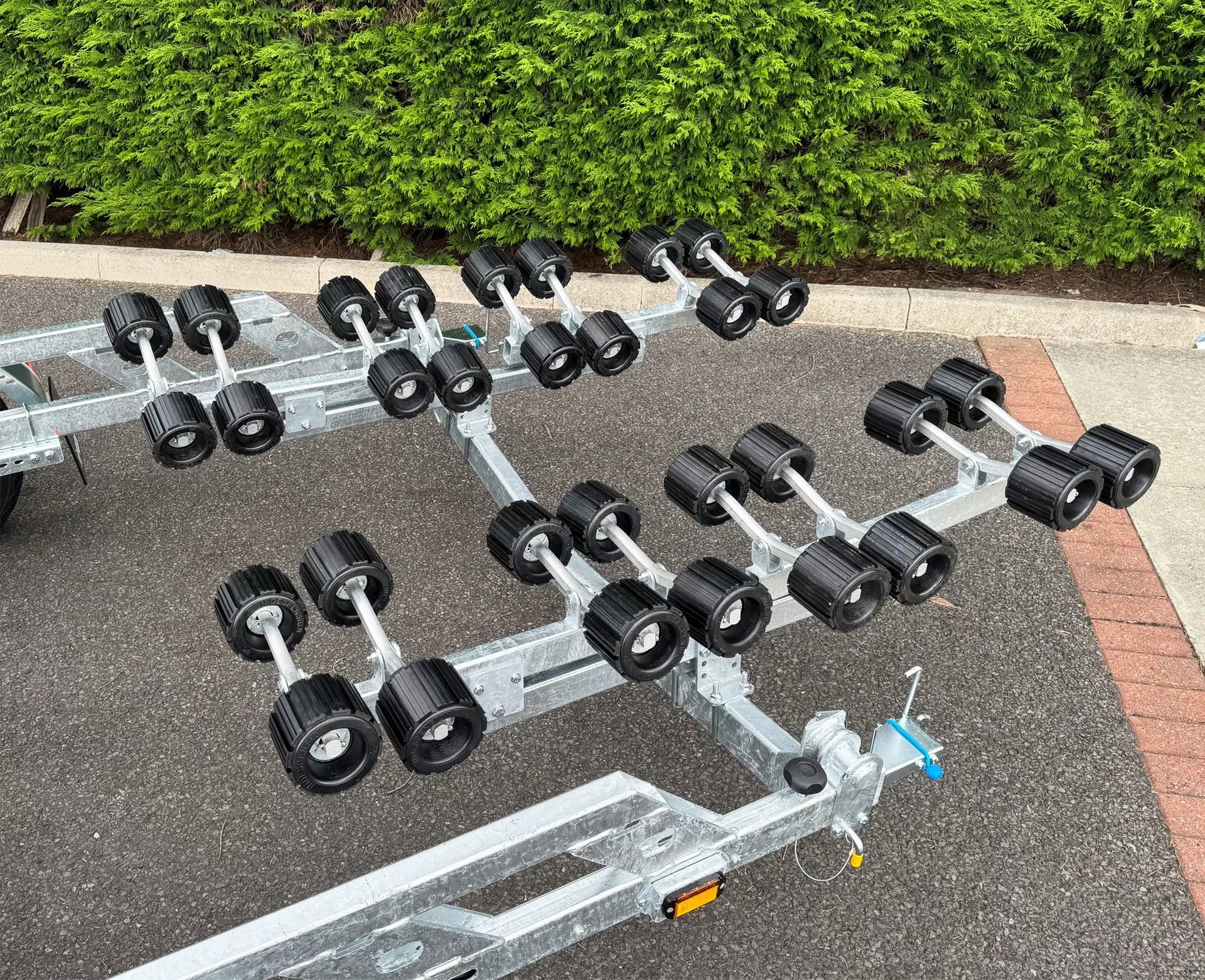 It is constructed with fully welded and hot dip galvanised chassis for maximum strength and durability, with no rusting. The Super Roller Coaster range of trailers are fitted with 65 Rollers in total, which are fitted and fully adjustable in all directions using U-bolts and is therefore suited to a variety of hull shapes. The support is height adjustable through multi-drilled front roller supports and multi-drilled rear roller angle brackets and a cranked swing beam (roller height increases towards outer edge and decreases in the centre). The swing beam helps to maintain maximum roller to hull contact during launch and recovery and has adjustable aluminium support arms which flex as the load increases.