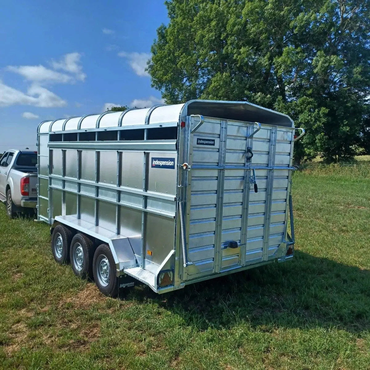 The LV35146TRI Livestock Cattle Trailer is a triple axle 14' x 6' x 6' high trailer, with a gross vehicle weight of 3500kg which allows in excess of 2150 Kg payload / capacity giving flexibility of use.